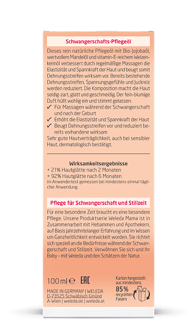 Das zu 100% natürliche Weleda Schwangerschafts-Pflegeöl verbessert durch regelmäßiges Einmassieren auf natürliche Weise die Elastizität der Haut und hilft so, Dehnungsstreifen vorzubeugen. Lass deinem wachsenden Bauch ganz einfach die nötige Pflege zukommen. Pflege die Haut vom ersten Tag der Schwangerschaft und halte sie geschmeidig. Das gemeinsam mit Hebammen entwickelte Weleda Schwangerschafts-Pflegeöl enthält wertvolles Mandel- und Bio-Jojobaöl, Vitamin-E-reiches Weizenkeimöl und einen Extrakt aus Arnikablüten. Der zarte blumige Duft von Rose, Neroli und Myrrhe stimmt dich zuversichtlich und gelassen.